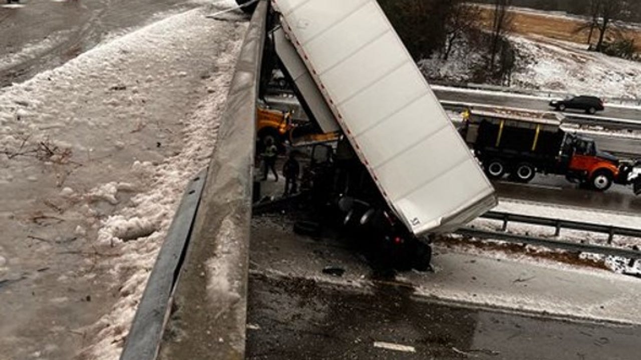Tractor-trailer falls from icy North Carolina overpass after driver loses control