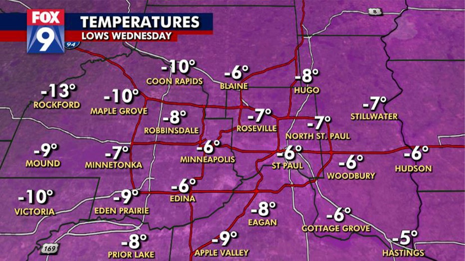 Temperatures are going to struggle to make it above zero on Wednesday. Parts of northwestern Minnesota will see subzero highs, but highs in the metro should get into the single digits.